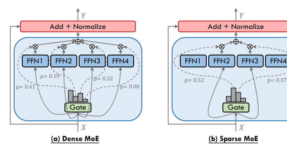 Fig. 2. An illustration of an MoE layer in Transformer-based models. For each input X, the linear-softmax gating will select all experts namely (a) Dense MoE or top-k experts namely (b) Sparse MoE to perform conditional computation. The expert layer returns the output of the selected expert multiplied by the gate value (softmax of the gating function output).