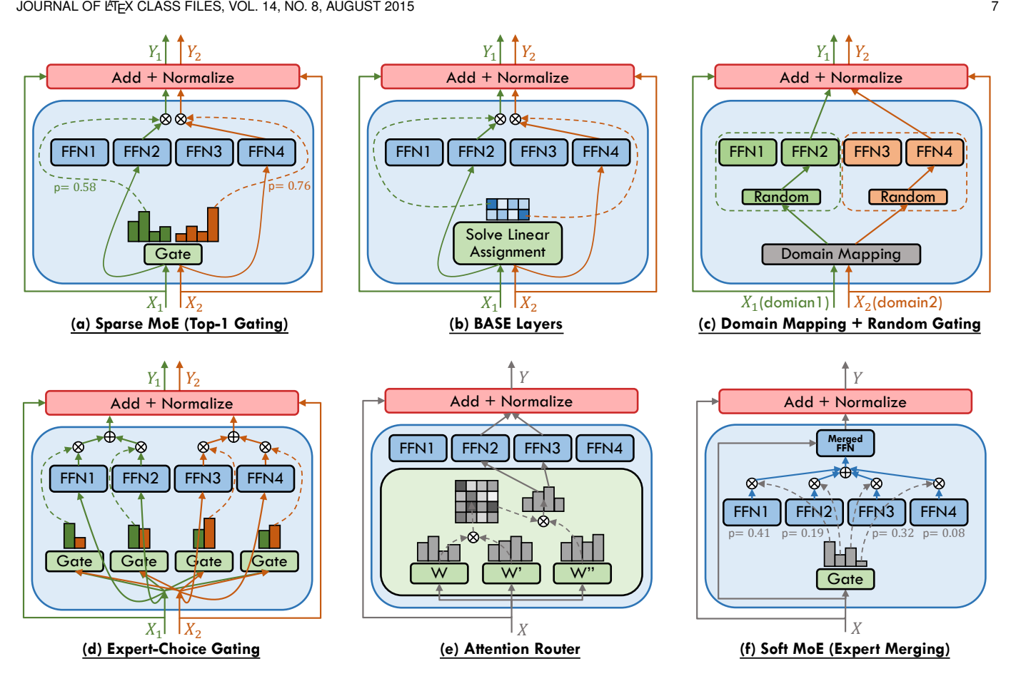 Under this taxonomy, we first delve into MoE algorithmic advancements, particularly the prevalent substitution of feed-forward network (FFN) layers with MoE layers in transformer-based LLMs [25], [26], [30], [33], [34], [35], [36]. As each MoE layer integrates multiple FFNs—each designated as an expert—and employs a gating function to activate a selected subset of these experts, we explore the design choices of gating function and expert network, alongside collections of available open-source implementations, hyperparameter configurations, and empirical evaluations. Furthermore, to underscore the flexibility and versatility of MoE, we extend our analysis beyond the standard integration of MoE into model backbone, and discuss an array of novel MoE-related designs, such as soft MoE with token or expert merging [37], [38], [39], [40], [41], mixture of parameter-efficient experts (MoPEs) [40], [42], [43], [44], [45], [46], training and inference schemes with model transition between dense and sparse [47], [48], [49], [50], [51], [52], and various derivatives [53], [54], [55], [56], [57], [58].