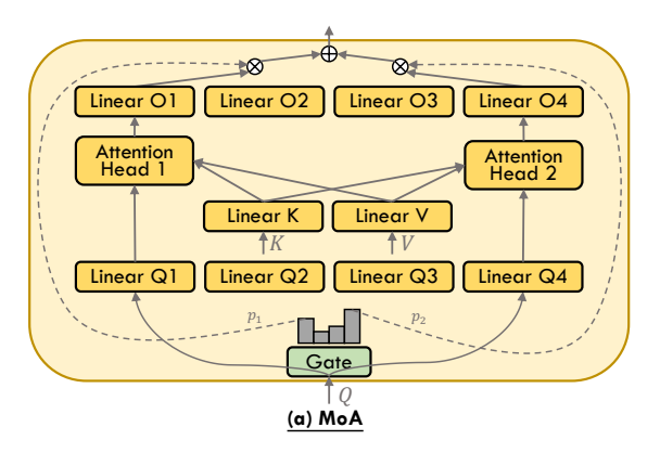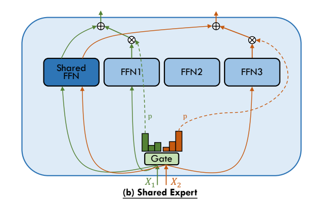 Pan et al. [62] posit that the parameter inefficiency observed in MoE models stems from conventional sparse training methodologies, where only a selected group of experts is engaged and refined for each input token. To counteract this, they introduce a hybrid framework for MoE models, denoted as DS-MoE, which integrates dense training (activating all the experts) with sparse inference (sparse expert activation) to achieve higher computation and parameter efficiency. Notably, DS-MoE maintains activation for all self-attention experts (MoA [80]) during inference but selectively activates FFN experts, reflecting the observation that self-attention layers manifest considerably less sparsity compared to FFN layers.