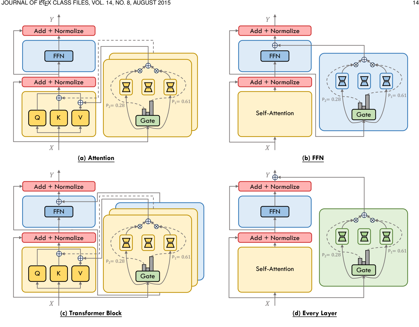 There has been considerable interest in incorporating MoPE into fundamental components such as the attention, FFN, and Transformer block. Existing work often approaches the attention mechanism and FFN independently, employing distinct gating mechanisms to modulate them separately. Rather than treating these elements isolated, there is a new direction that considers the Transformer layer as an integrated whole. This shift in perspective allows for the application of the MoPE framework to the entire Transformer layer, capturing the combined dynamics of the attention and FFN within a unified approach. As illustrated in Figure 6(d), the forward process under the MoPE framework integrated with every layer is as follows: