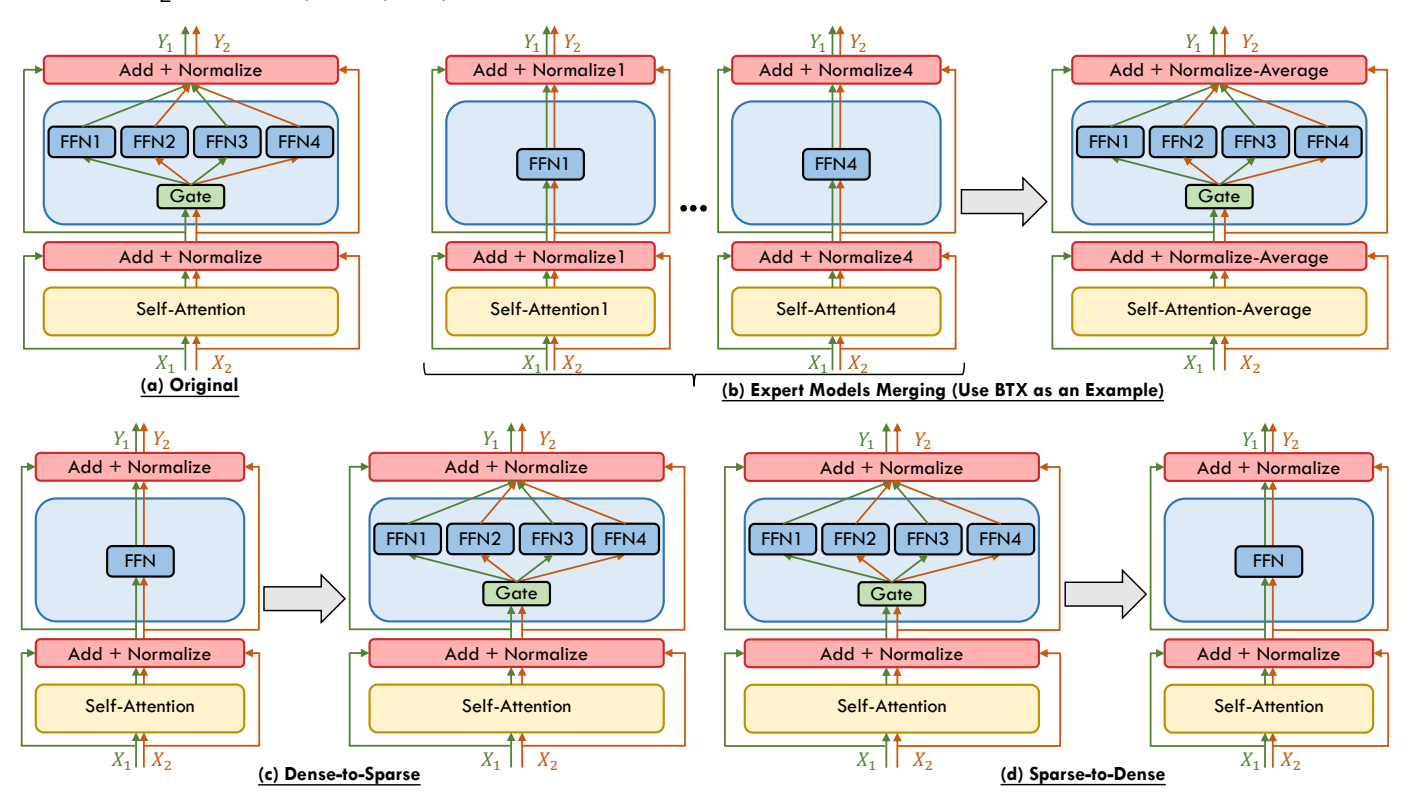 Fig. 7. Schematic representation of training and inference schemes related to MoE. It provides an abstracted view of model transition, without focusing specific model states during training or inference. Subfigure (a) depicts the original scheme without architectural transformation. Subfigure (b) depicts the merging of distinct expert models, exemplified by BTX [52]. Subfigure (c) depicts the transition from a dense model to a sparse model. Subfigure (d) depicts the inverse process, where a sparse model is converted to a dense model.