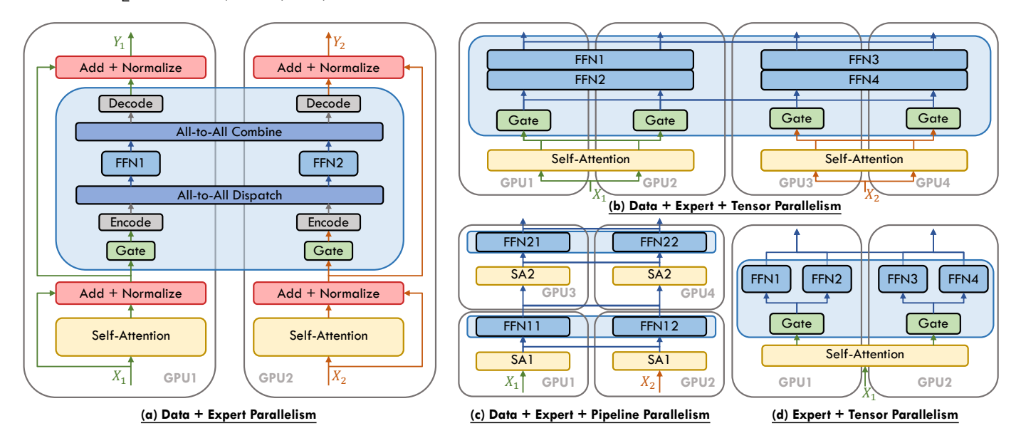 Fig. 8. Schematic depiction of diverse parallel strategies for MoE. For clarity and conciseness, this illustration omits some All-to-All, All-Reduce, Point-to-Point communication within parallelism, and Normalization, Encode, Decode, Gate in subfigures (b), (c), and (d).