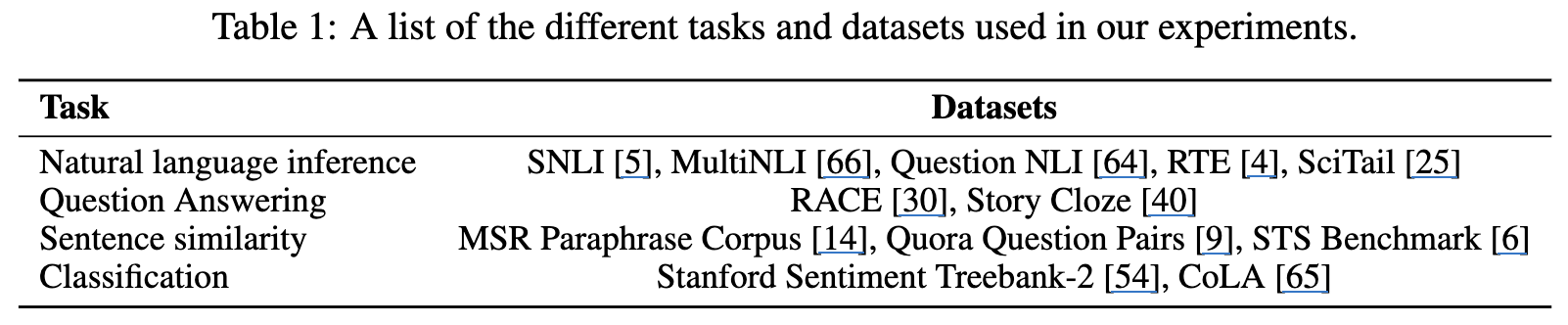 - Sentence similarity Task: MSR Paraphrase Corpus, Quora Question Pairs, STS