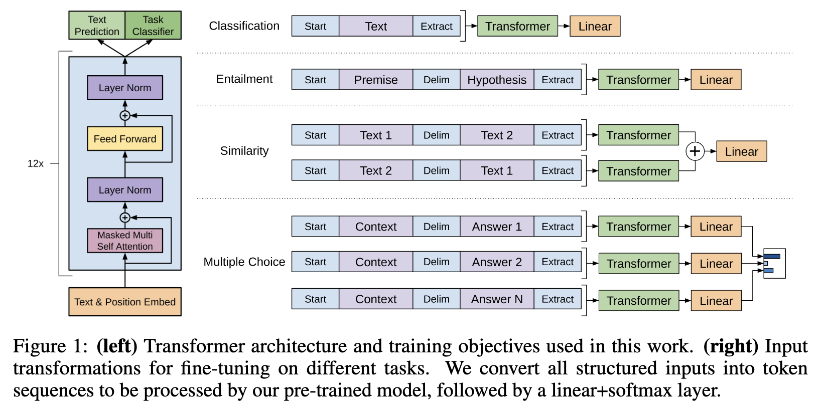 - Auxiliary Objective: fine-tuning 시 language modeling objective를 함께 학습시키면 모델의 일반화 능력이 좋아지고 학습이 빨라짐.