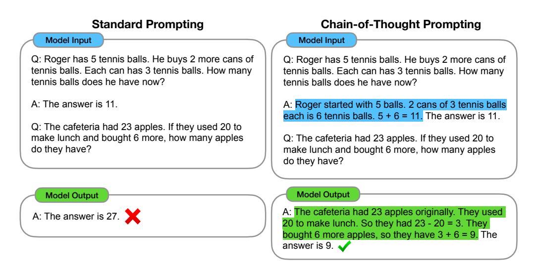 Figure 1: Chain-of-thought prompting enables large language models to tackle complex arithmetic, commonsense, and symbolic reasoning tasks. Chain-of-thought reasoning processes are highlighted.