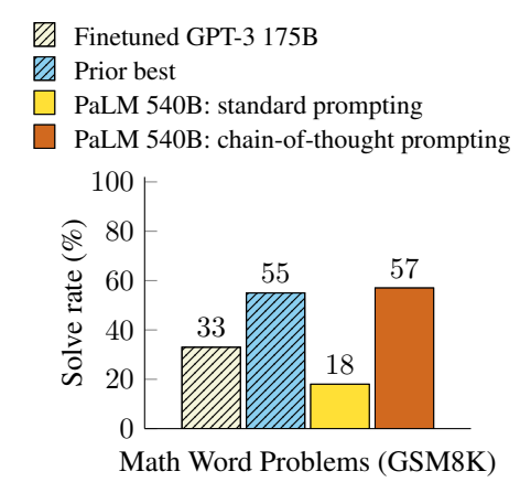 Figure 2: PaLM 540B uses chain-ofthought prompting to achieve new stateof-the-art performance on the GSM8K benchmark of math word problems. Finetuned GPT-3 and prior best are from Cobbe et al. (2021).
