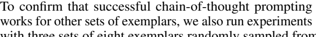 Experiments on three large language models show that chain-of-thought prompting improves performance on a range of arithmetic, commonsense, and symbolic reasoning tasks. The empirical gains can be striking. For instance, prompting a PaLM 540B with just eight chain-of-thought exemplars achieves state-of-the-art accuracy on the GSM8K benchmark of math word problems, surpassing even finetuned GPT-3 with a verifier.