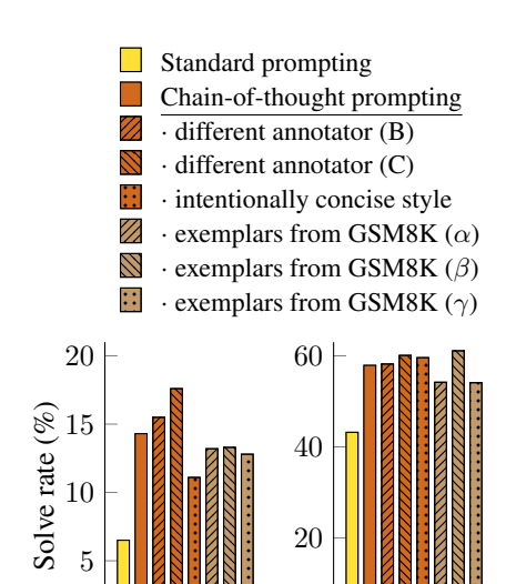 - LaMDA PaLM 0 20 40 60 GSM8K solve rate (%) Standard prompting Equation only Variable compute only Reasoning after answer Chain-of-thought prompting