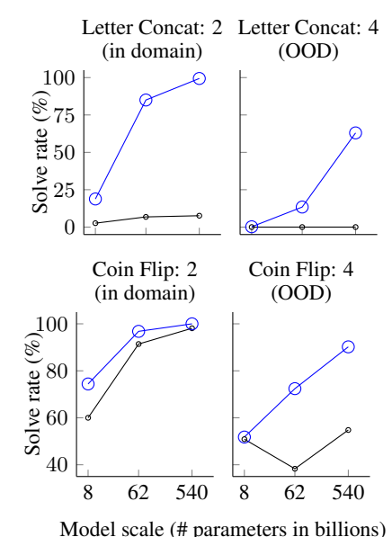 The NLP landscape has recently been revolutionized by language models (Peters et al., 2018; Devlin et al., 2019; Brown et al., 2020, inter alia). Scaling up the size of language models has been shown to confer a range of benefits, such as improved performance and sample efficiency (Kaplan et al., 2020; Brown et al., 2020, inter alia). However, scaling up model size alone has not proved sufficient for achieving high performance on challenging tasks such as arithmetic, commonsense, and symbolic reasoning (Rae et al., 2021).
