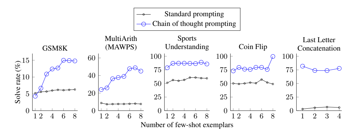 - Finally, chain-of-thought reasoning can be readily elicited in sufficiently large off-the-shelf language models simply by including examples of chain of thought sequences into the exemplars of few-shot prompting.