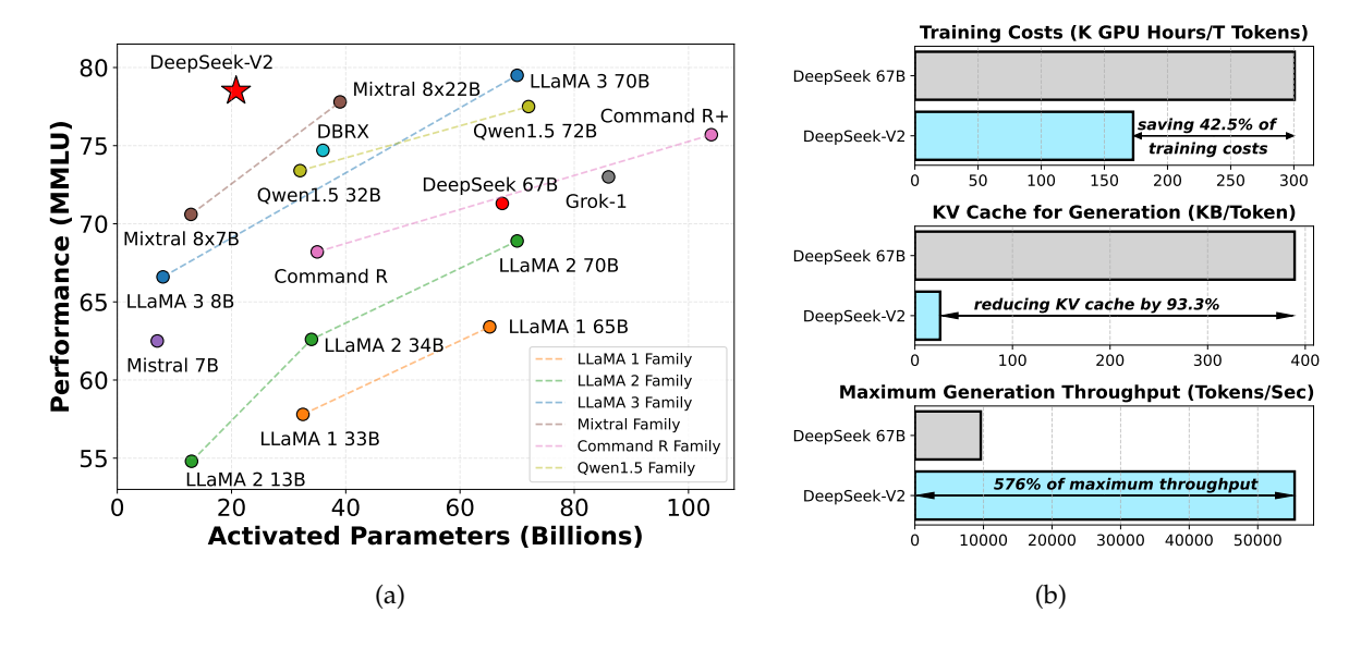 Figure 1 | (a) MMLU accuracy vs. activated parameters, among different open-source models. (b) Training costs and inference efficiency of DeepSeek 67B (Dense) and DeepSeek-V2.