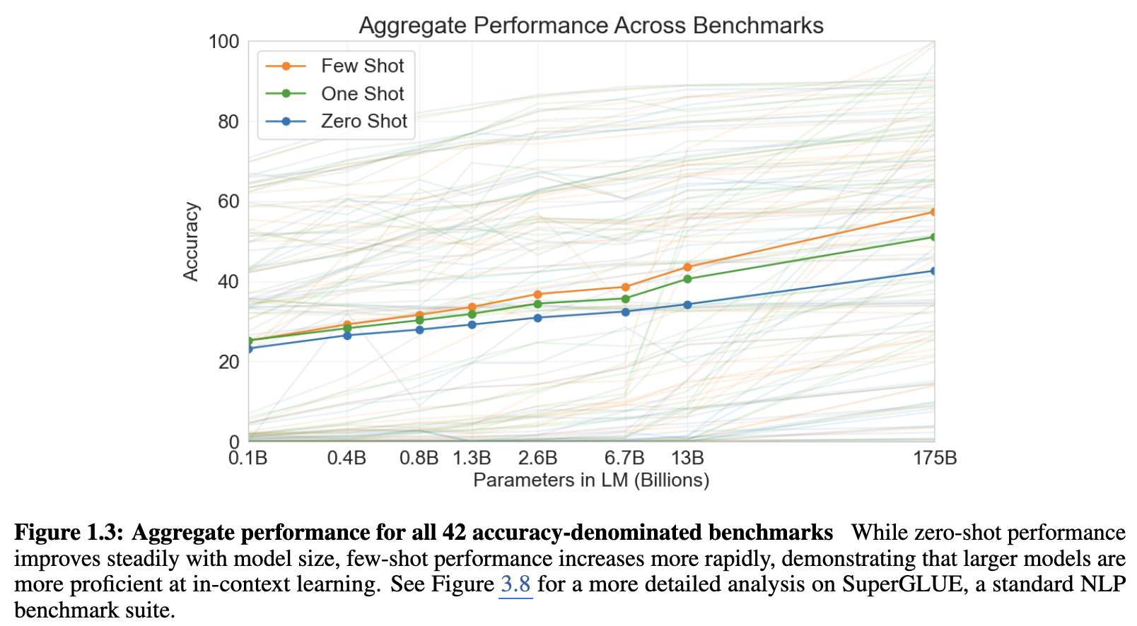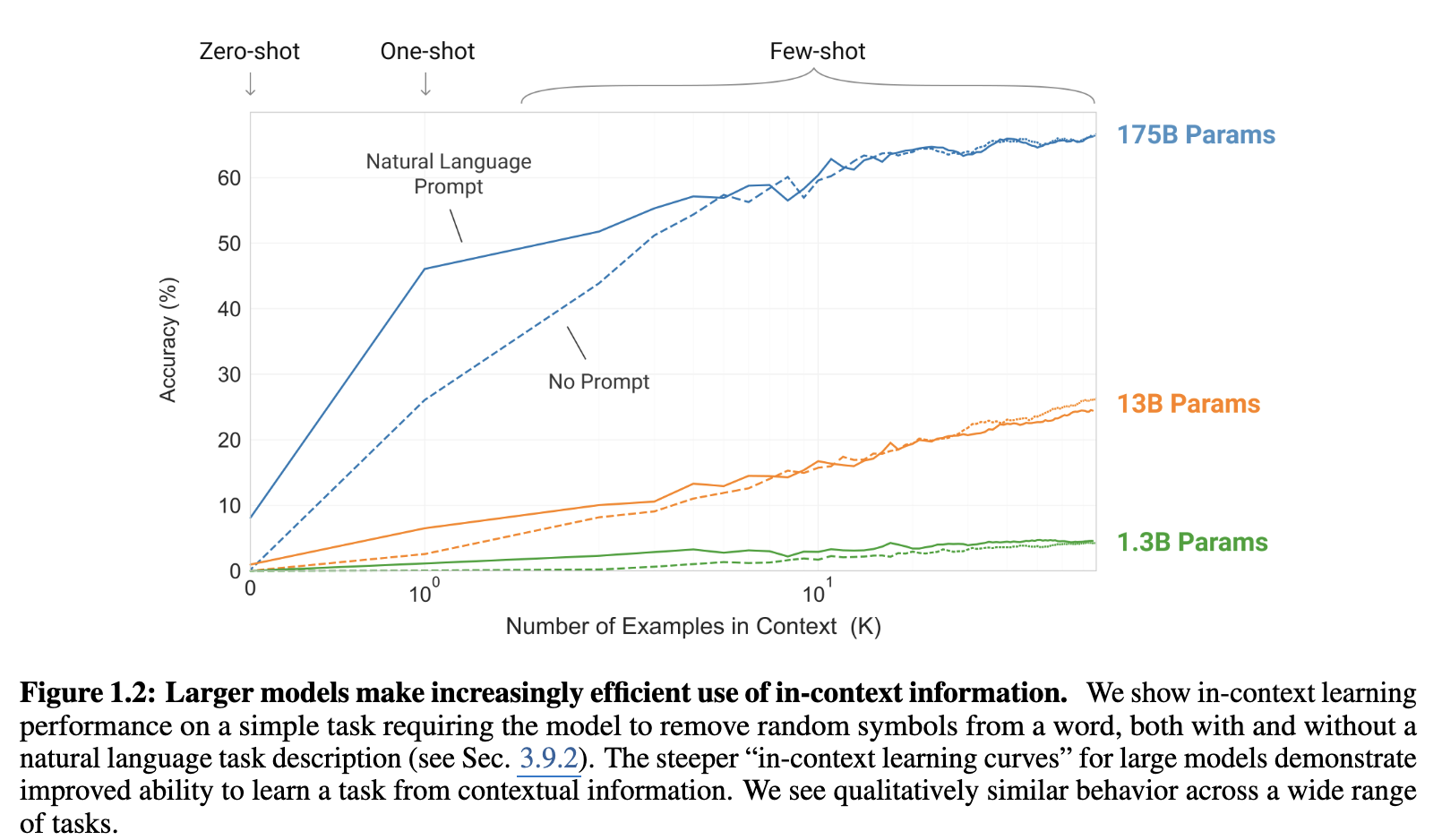 모델의 규모를 키우다보면, (GPT3는 175B인데, GPT2 약 10배 정도) 모델의 추가적인 파라미터 변경 없이도 learning behavior가 보이는 것 같은데, 이를 ‘in-context learning’이라고 한다.