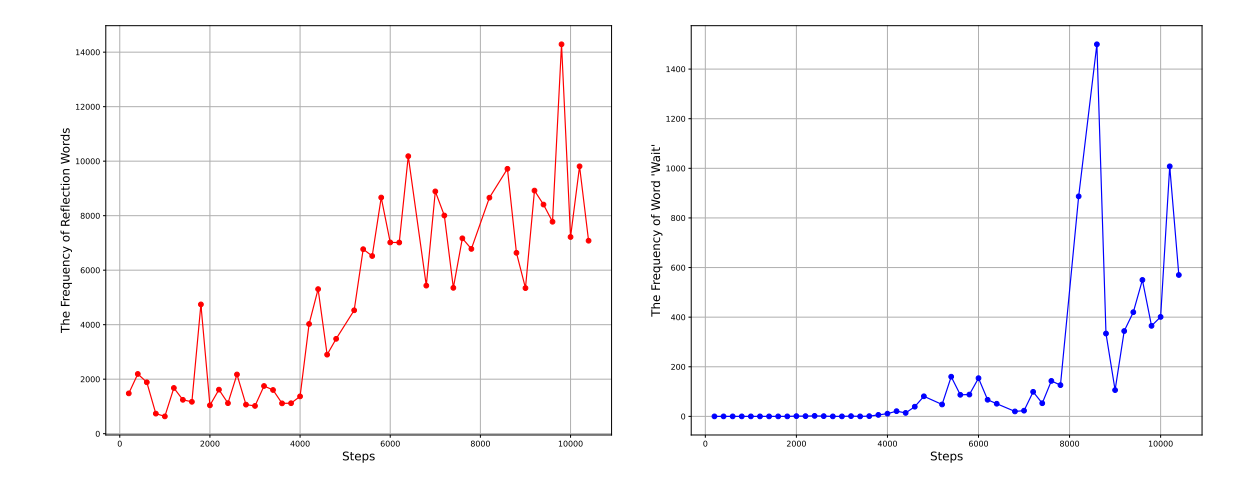 In conclusion, we observe a gradual increase in the model’s reflective behavior during training, while certain reflection patterns like the use of “wait” emerge at specific points in the training process.