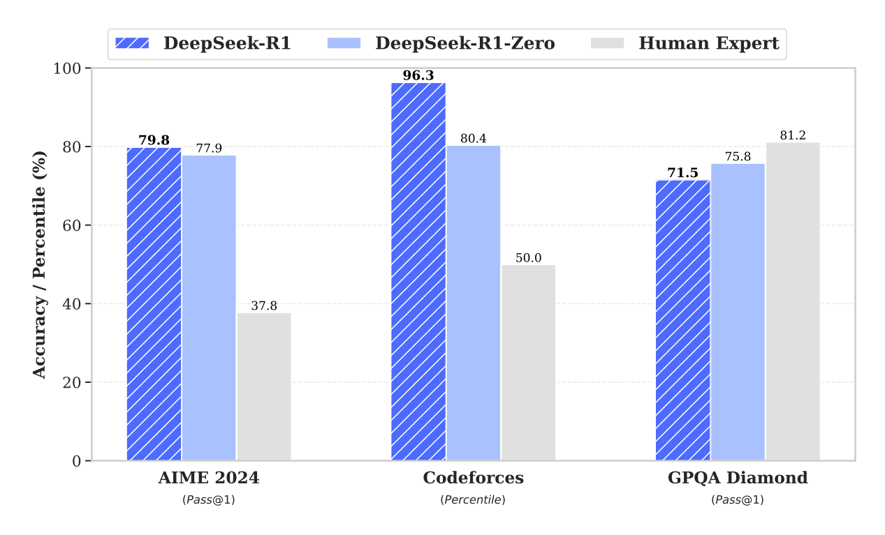 Figure 10 | The benchmark performance of DeepSeek-R1 and DeepSeek-R1-Zero is compared with human scores across different datasets. For AIME and Codeforces, the human scores represent the average performance of all human competitors. In the case of GPQA, the human score corresponds to Ph.D.-level individuals who had access to the web for answering the questions.