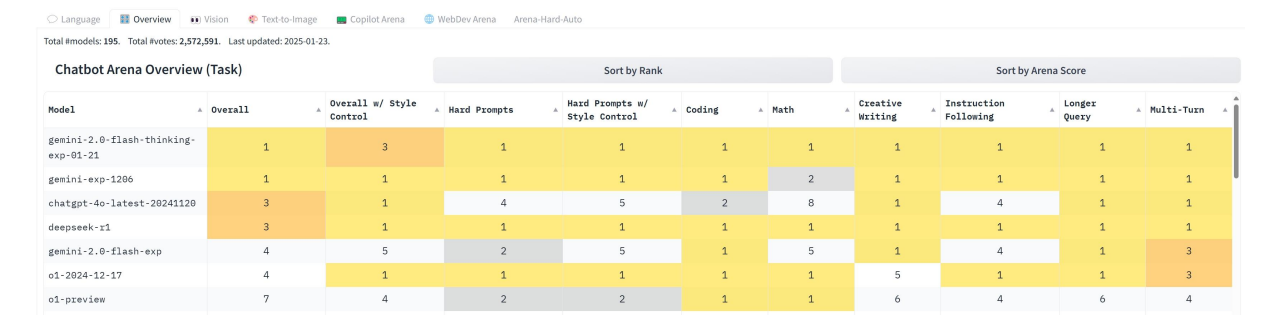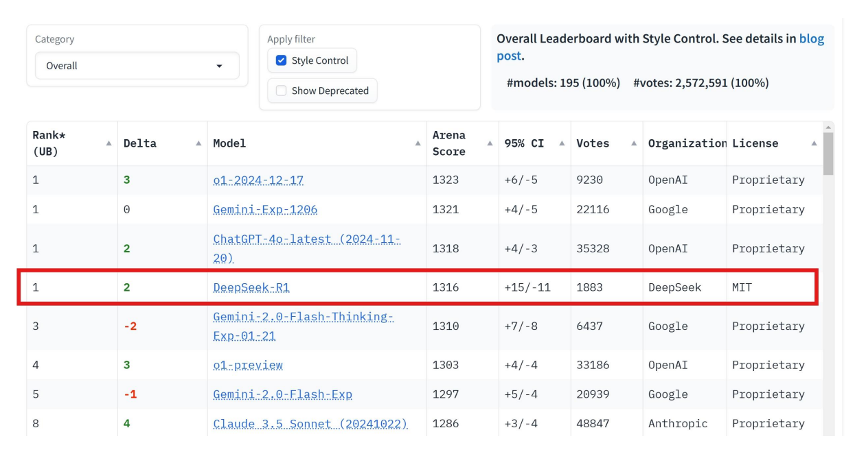 Figure 11 | The style control ranking on ChatBotArena of DeepSeek-R1. The screenshot is captured on January 24, 2025, one week after model release. The ranking is dynamically updated in real time as the number of votes increases.
