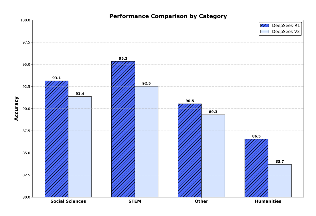 DeepSeek-R1 has demonstrated remarkable performance in ChatbotArena. Figure 11 presents the overall ranking of DeepSeek-R1 on ChatbotArena as of January 24, 2025, where DeepSeek-R1 shares the first position alongside OpenAI-o1 and Gemini-Exp-1206 on the style control setting. Style control refers to a feature introduced to separate the influence of a model’s response style (e.g., length, formatting, tone) from its substantive content (e.g., accuracy, relevance, reasoning) when evaluating and ranking LLMs. This addresses the question of whether models can “game” human preferences by producing responses that are longer, more polished, or better formatted, even if their content isn’t necessarily superior. It is a huge milestone that an open-source model under the MIT License could achieve comparable performance with closed-source models, especially considering that the cost of DeepSeek-R1 is relatively inexpensive. Figure 12 illustrates the rankings across different evaluation dimensions, highlighting DeepSeek-R1’s strong performance in mathematics, coding, and other areas. This demonstrates that DeepSeek-R1 excels not only in reasoning but also across a wide range of domains.