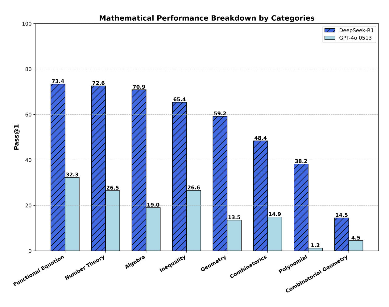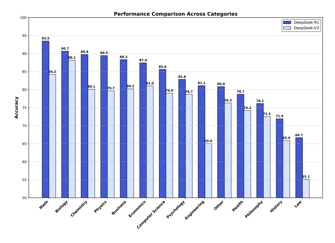 Figure 10 presents a comparative analysis of the performance of DeepSeek-R1-Zero, DeepSeek-R1, and human participants across several benchmark competitions. Notably, the AIME is a mathematics competition designed for high school students, and DeepSeek-R1 demonstrates performance that surpasses the mean score achieved by human competitors in this event. On the Codeforces platform, DeepSeek-R1 outperforms 96.3% of human participants, underscoring its advanced problem-solving capabilities. In the case of GPQA, where human experts—typically individuals with Ph.D.-level qualifications and access to web resources—participate, human performance remains superior to that of DeepSeek-R1. However, we anticipate that enabling web access for DeepSeek-R1 could substantially enhance its performance on GPQA, potentially narrowing or closing the observed gap.
