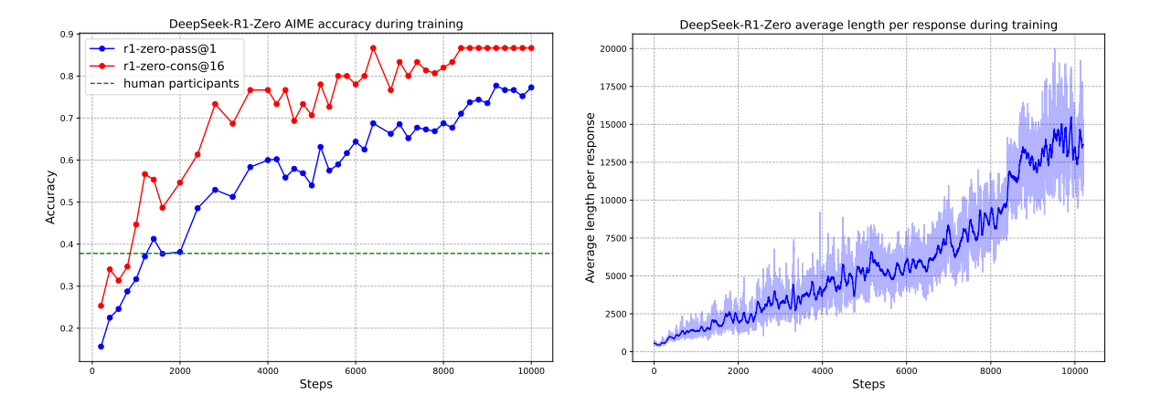 - 도표 1(a): RL 훈련 과정에서 DeepSeek-R1-Zero의 AIME 2024 성능 추이