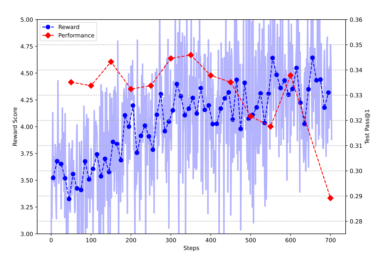 Figure 6 | Reward hacking: the reward exhibits an increasing trend as the performance on CodeForces decreases for training.