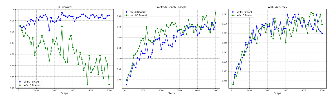 To study the impact of the Language Consistency (LC) Reward, we conduct an ablation experiment on DeepSeek-R1-Distill-Qwen-7B. This model uses the same cold start data as DeepSeek-R1
