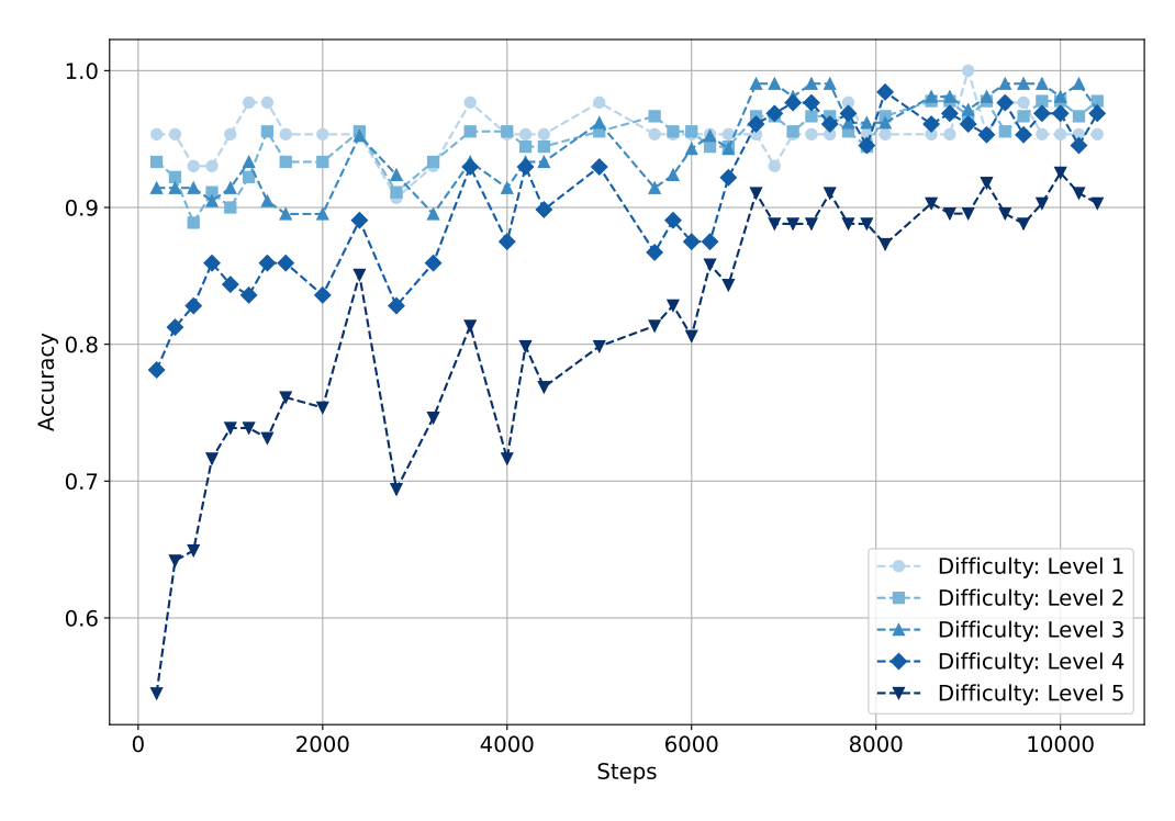 Despite these nuances in comparing raw accuracy percentages across difficulty levels, the training trends still demonstrate that while simpler reasoning tasks (for humans) are mastered early in training, the model’s capability on complex reasoning problems (level 3-5) significantly improves over time.
