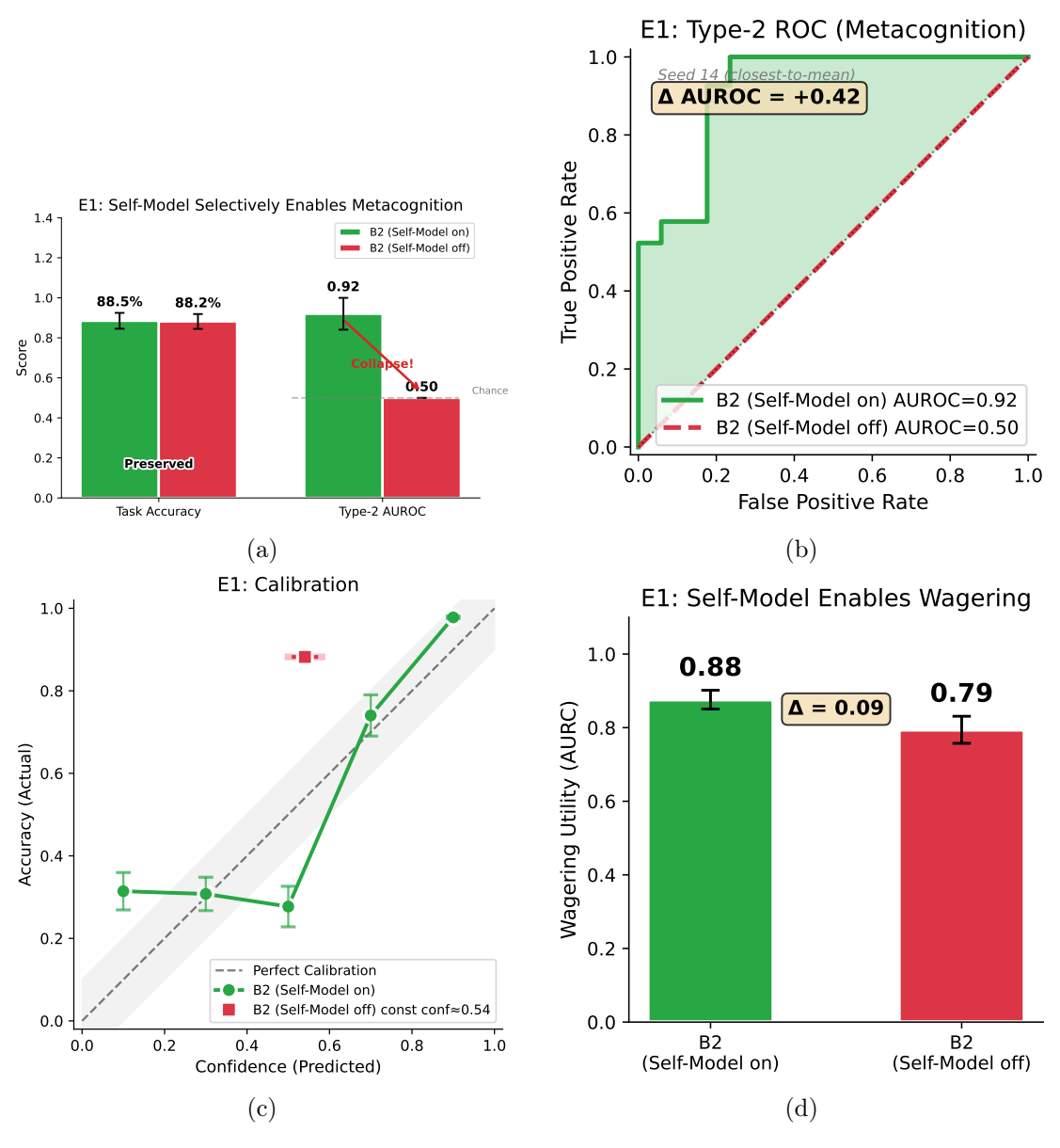 Figure 1 presents the main findings. The Self-Model ablation produced a dissociation between first-order task performance and second-order metacognitive sensitivity.