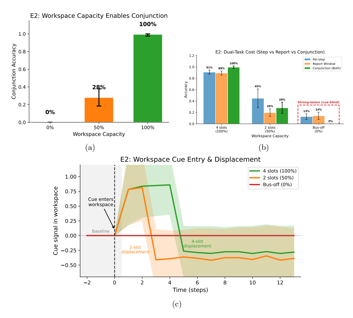 Figure 2: Workspace capacity determines information access. (a) Conjunction accuracy by workspace capacity (n=20 seeds; mean SD): at 4 slots, at 2 slots, at bus-off. Full vs. half capacity: Welch’s t-test (seed-level), Hedges’ g=9.70. Baseline agents (A0, A1) achieve near-chance under strong-lesion wiring (not shown; see text); B1 at full capacity strongly outperforms both baselines (g>3). (b) Dual-task cost summary: per-step accuracy, report-window decision accuracy, and conjunction success by capacity. Conjunction collapses at bus-off; the report-window decision is most sensitive to capacity reduction. (c) Workspace cue entry and displacement under backward masking. Cue signal (y-axis) jumps at cue entry, persists for a capacity-dependent duration, then decays as distractors displace cue content. Four slots: signal persists through 4 masks; two slots: faster displacement; bus-off: no signal (flat at 0). Note: A finer 5-level capacity sweep (0%, 25%, 50%, 75%, 100%) was conducted for the NRS analysis (see text) but is not shown here.