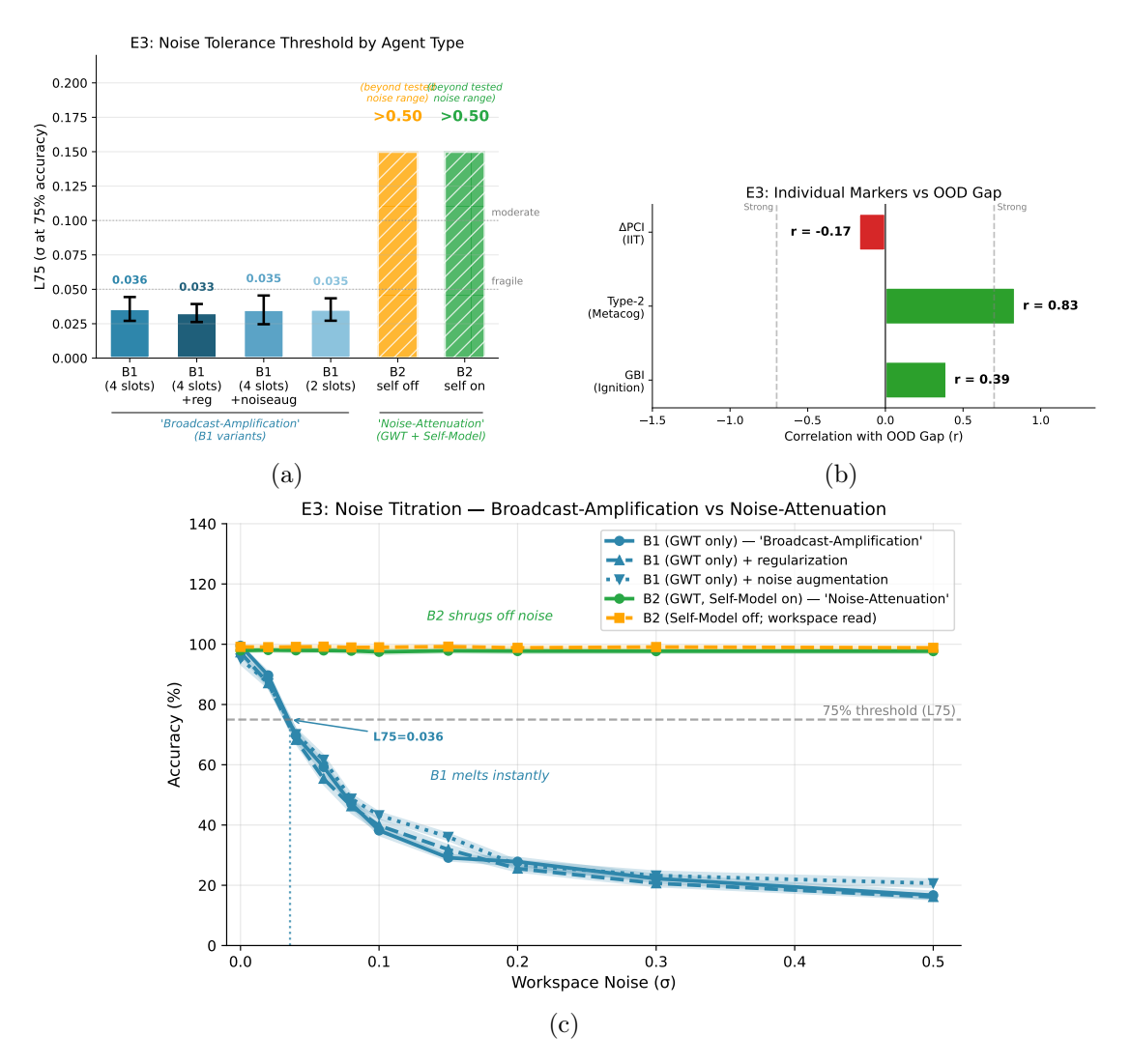 - Broadcast-Amplification vs. Noise-Attenuation: Contrary to the intuition that broadcasting creates robustness [Baars, 1988, Bengio, 2017], we find that a global workspace alone exhibits a broadcast-amplification effect: it broadcasts information but also amplifies noise, making the system fragile even under standard regularization and noise augmentation. In our implementation, the B2 agent family remains robust in the same perturbation regime (L75 > 0.50), including in a Self-Model-off / workspace-read control; we therefore treat noise-attenuation as an empirical robustness property of the B2 family rather than as a bottleneck-only effect.