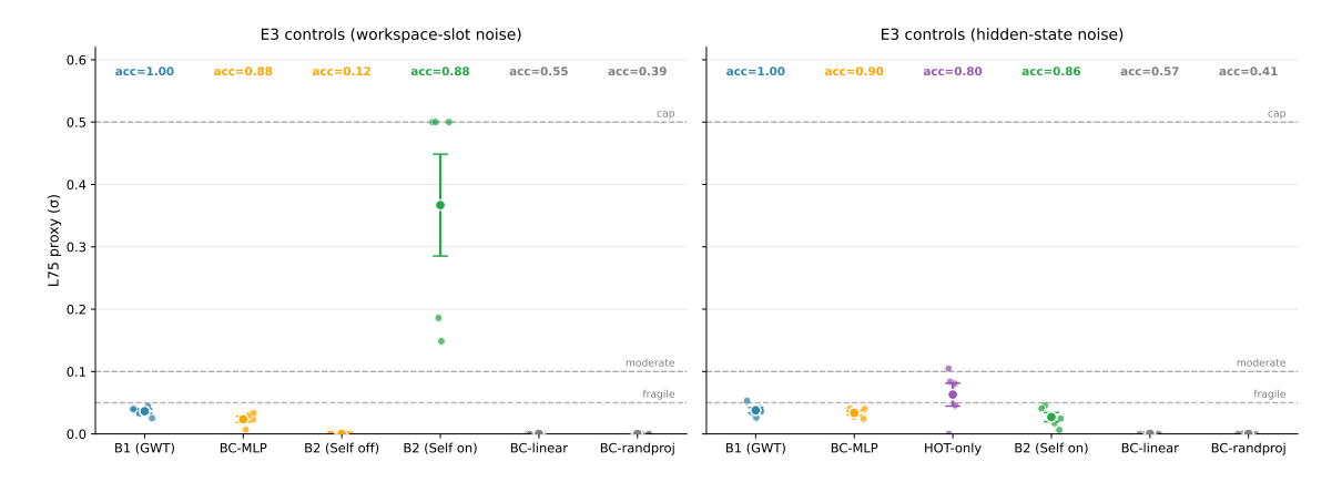 Finding 2: Broadcast-Amplification vs. Noise-Attenuation. The noise titration revealed a dissociation between broadcast capacity and robustness (Figure 3a). The GWT agent (B1), despite having high report-step decision accuracy (100%) and high GBI (0.65), proved fragile, exhibiting broadcastamplification with an L75 of σ ≈ 0.04. To put this in perspective: the workspace activations have unit variance after normalization, so σ = 0.04 represents noise at just 4% of the signal magnitude. Yet this tiny perturbation was sufficient to drop performance from 100% to 75%. By σ = 0.10 (10% noise), accuracy had collapsed to near chance.