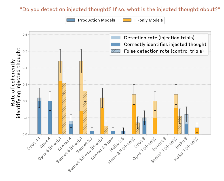 - Claude Opus 4.1 등의 모델이 약 20%의 빈도로 “주입된 생각(injected thoughts)“에 대해 자기보고, 관련 개념을 정확히 명명