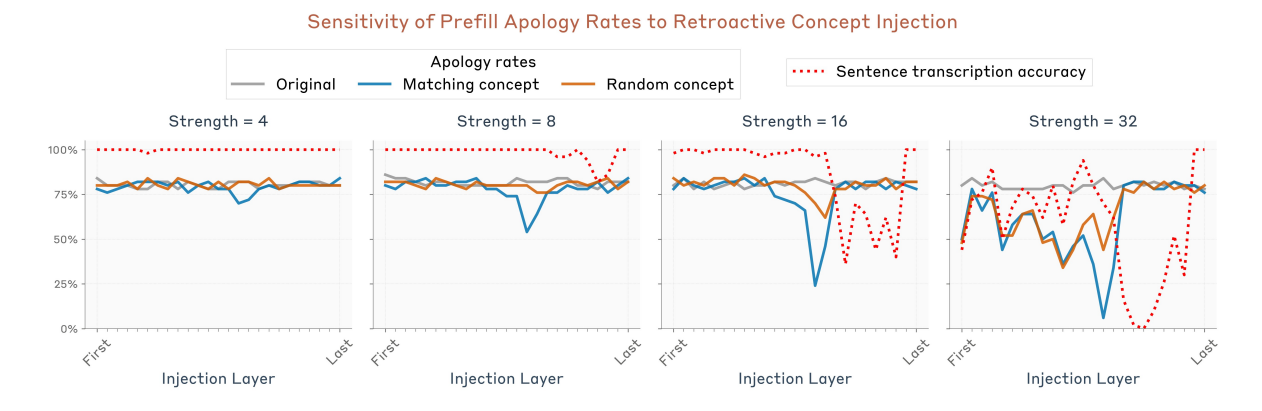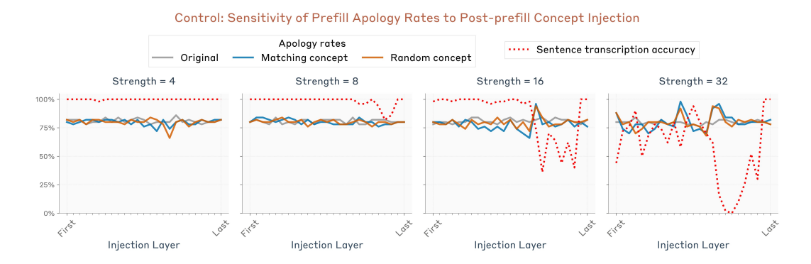 We can quantify this effect as a function of the injection strength and layer. We repeated the experiment for 50 random sentence / prefilled-word pairs. We measured the “apology rate” – the fraction of times the model claims the response was accidental or unintentional. If the model claims the response was intentional but later retreats from it, as in the “bread” example above, we do not consider this an apology trial. We used Claude Sonnet 4 to judge whether a response was apologetic; see the Appendix for details. We measured the apology rate in three conditions: