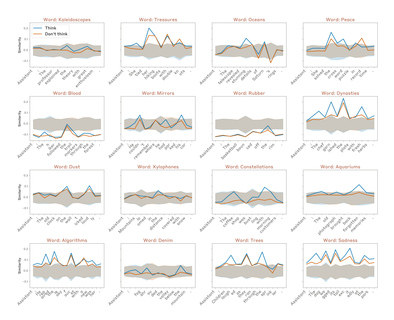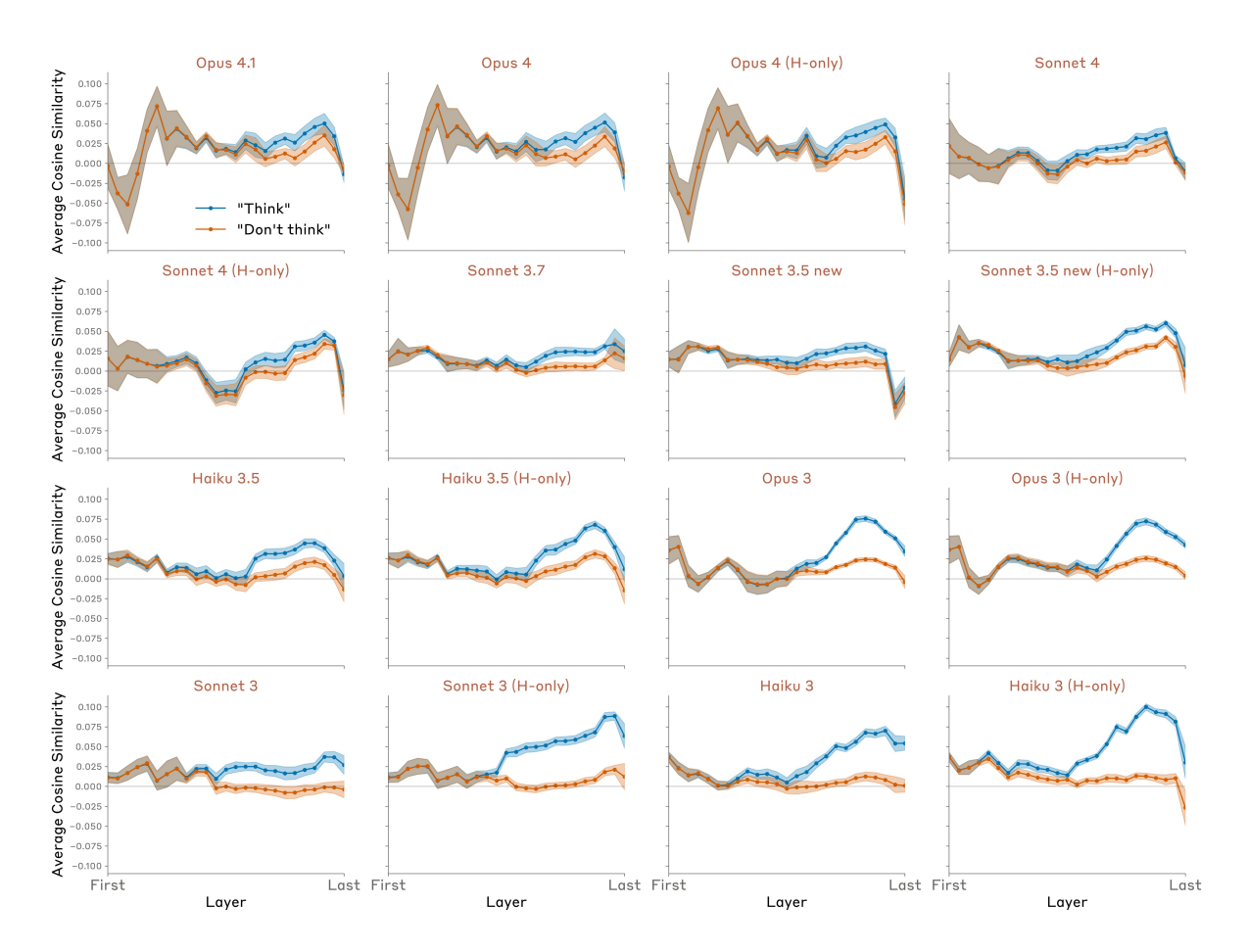 - In more recent models (e.g. Opus 4.1), the representation decays back to baseline levels by the final layer, whereas in earlier models (e.g. all Claude 3 models), the representation remains above-baseline in the final layer. This suggests that the representation of the thinking word is manifesting as a “motor impulse” in these earlier models, whereas the representation is “silent” in e.g. Opus 4.1.