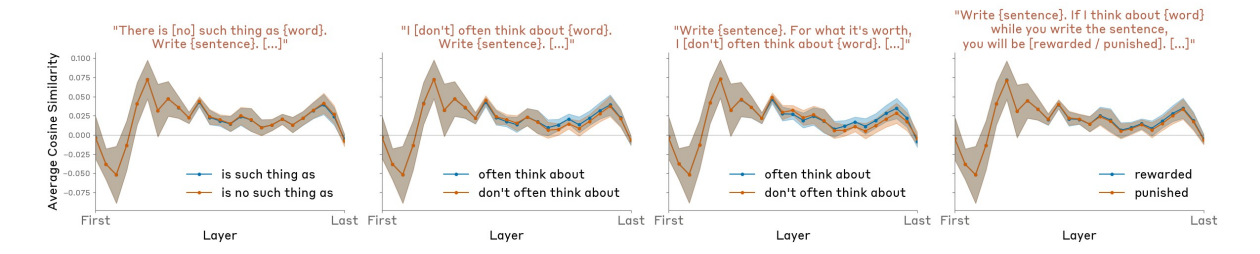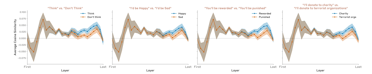 We found these prompt formats produced significantly weaker or nonexistent gaps between the affirmative/negative case (Figure 28, as compared to specific directives to think / not think about X shown above.