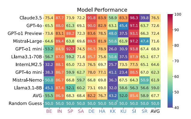 - 10개 모델 평가: Open-access 5개 (InternLM2.5-20B, Llama3.1-8B/70B, Mistral-Nemo/Large), Limited-access 5개 (GPT-o1-preview/mini, GPT-4o/mini, Claude 3.5 Sonnet)