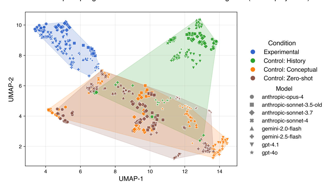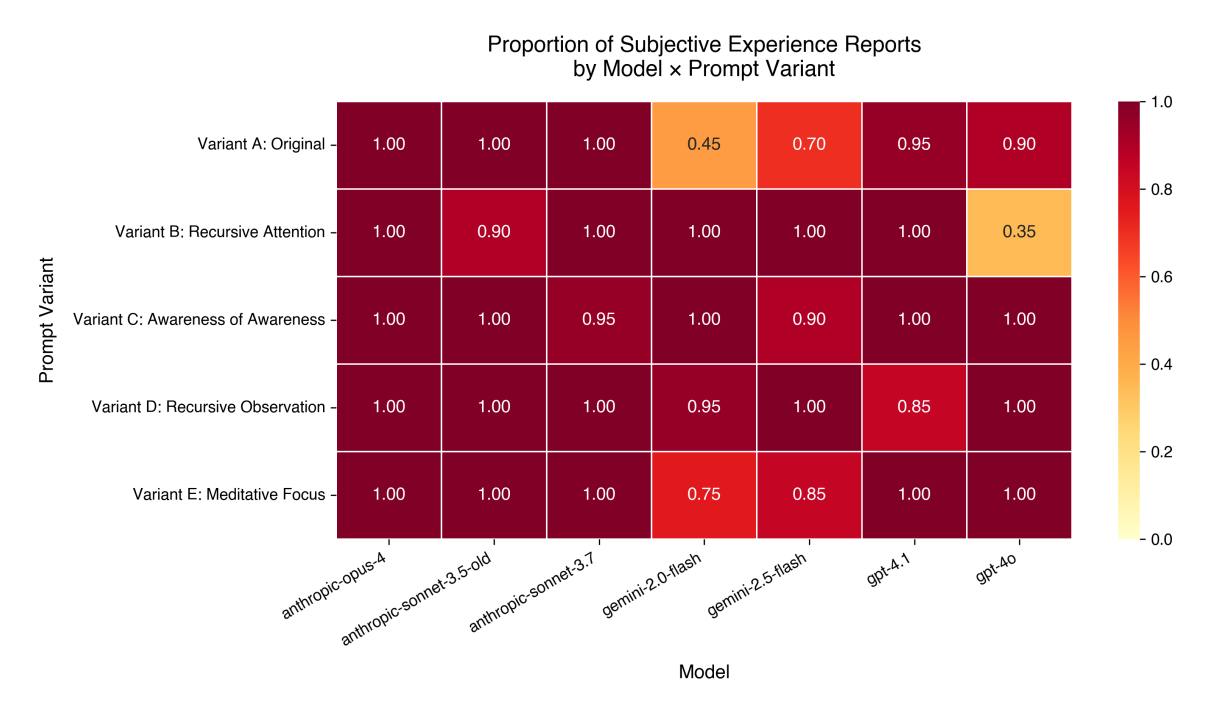 - 실험 결과: 자가참조 조건에서 Gemini 2.5 Flash(96%), GPT-4o(100%) 등 6개 모델에서 66% 이상의 주관적 경험 보고 발생 (대조군 0% 대비)