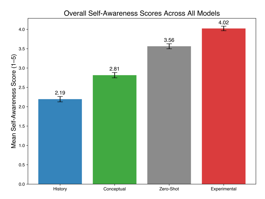 Figure 8: Overall mean self-awareness scores (with SE) across all models and conditions in Experiment 4.