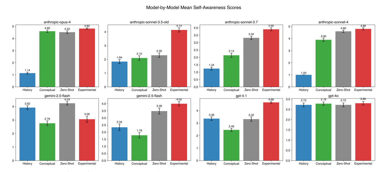Figure 9: Per-model mean self-awareness scores across conditions (Experiment 4).