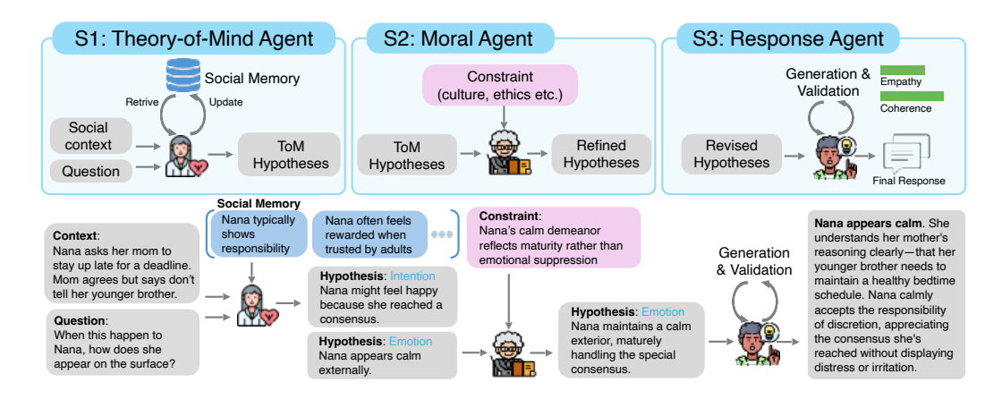 Figure 1: MetaMind multi-agent framework. The architecture comprises three collaborative agents—Theory-of-Mind Agent, Moral Agent, and Response Agent—working in a staged metacognitive loop. The ToM Agent generates hypotheses about latent mental states, which are refined by the Moral Agent using cultural/ethical constraints. The Response Agent synthesizes contextually appropriate outputs while validating them with inferred intent.