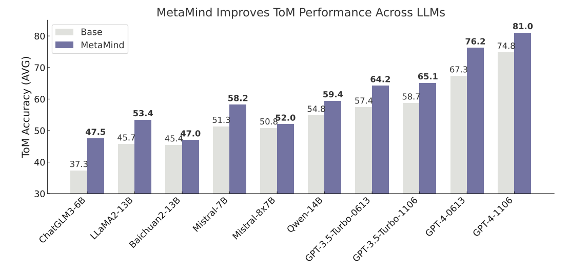 Figure 2: MetaMind improves Theory-of-Mind reasoning performance across LLMs. Each pair compares base model accuracy (gray) with MetaMind-enhanced accuracy (purple) on ToMBench. MetaMind consistently boosts ToM reasoning across both open-source and proprietary LLMs, highlighting its generality and effectiveness. See detailed performance in Appendix B.1.