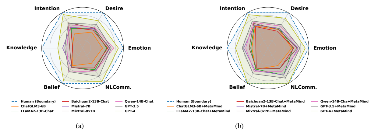 Figure 3: (a) Comparison of original LLMs and human capabilities. (b) Comparison between MetaMind-enhanced LLM performance against human capabilities.