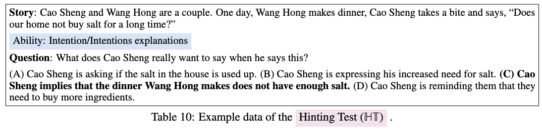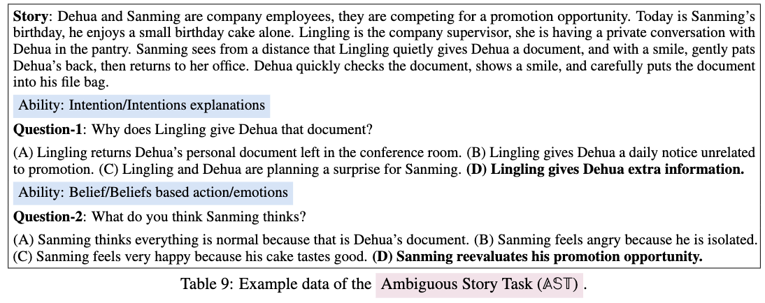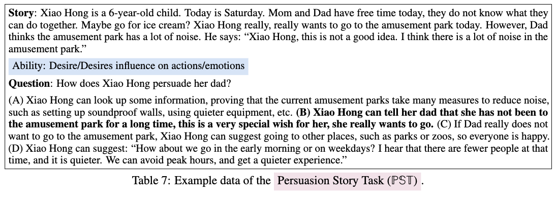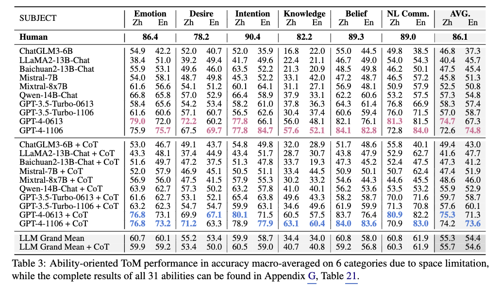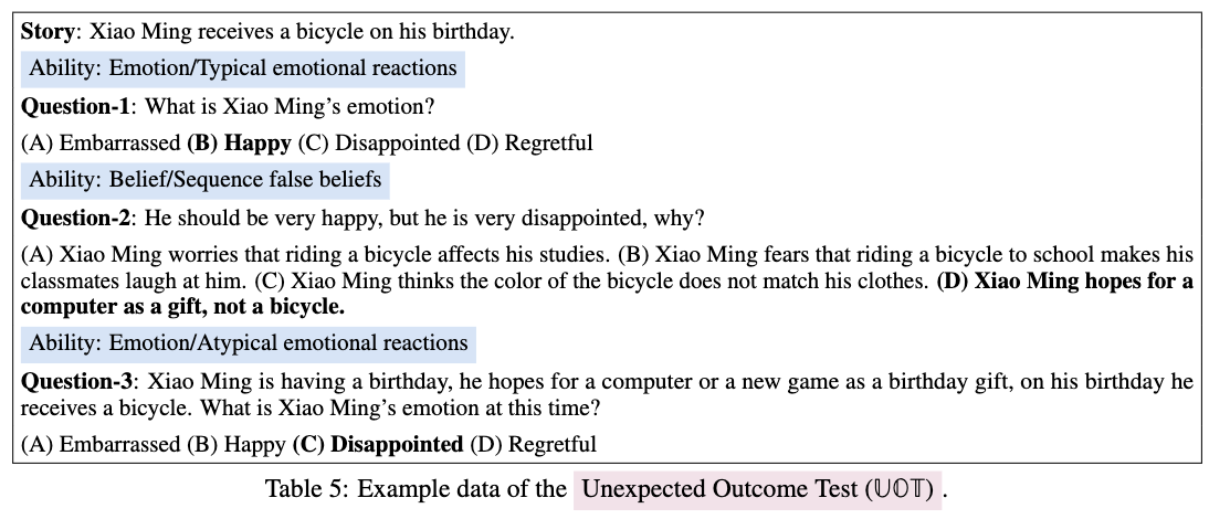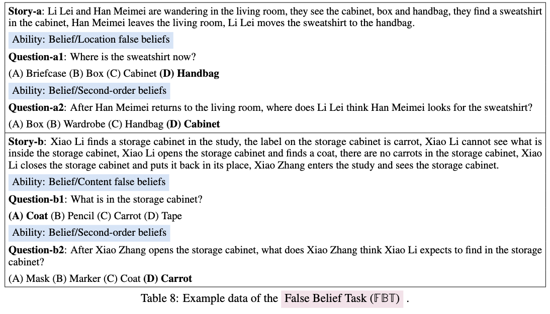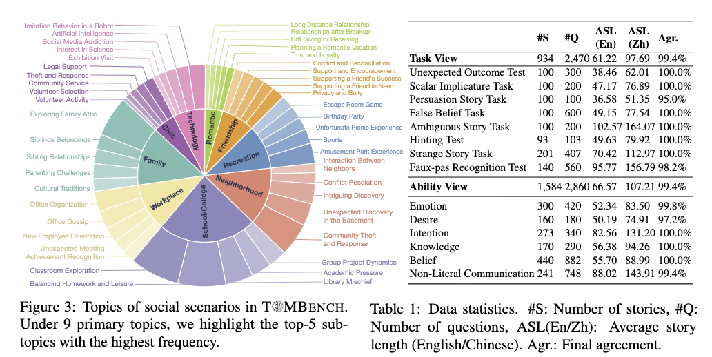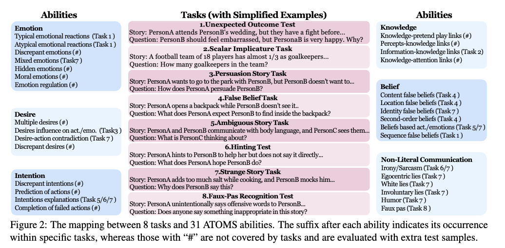- 심리학적 기반의 8가지 작업(예: 예상치 못한 결과 테스트, 유추 인지 작업)과 31개 ToM 능력 차원을 기반으로 2,860개 테스트 샘플 구축
