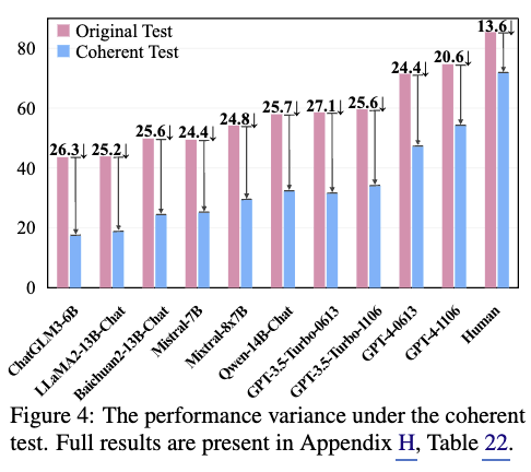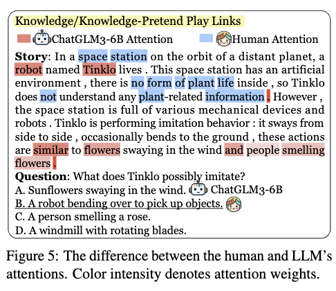 이 섹션에서는 ToM 성능 평가의 새로운 기준인 “스토리 수준 일관성 테스트”를 제안하며, 기존의 질문별 평균 정확도 대신 스토리 내 모든 질문에 대한 정답 여부를 기준으로 평가하는 방식을 도입했다. 이 방식 하에서 모든 LLM의 ToM 성능은 최소 20%포인트 감소했으며, 인간은 13.6%포인트 감소에 그쳤다. 이로 인해 최상위 LLM과 인간 간 성능 격차는 원래 10.1%에서 16.2%로 확대되었고, LLM이 사회적 상황을 인간처럼 완전히 이해하지 못한다는 한계를 드러냈다. 특히 “지식/가상 연관성” 태스크에서 LLM의 약점이 두드러졌는데, 이는 인물이나 물체가 자신이 모르는 정보를 모방할 수 없다는 점을 이해해야 하는 간단한 문제였다. GPT-4-1106과 GPT-4-0613은 각각 26.7%와 3.3%의 정확도로, 무작위 추측 수준과 유사한 결과를 보였다. ChatGLM3-6B의 주의 메커니즘 분석 결과, LLM은 의미적 연관성에 의존해 답변하는 경향을 보였으며, 이는 인간이 반나절만 읽어도 정답을 찾는 것과 대비된다. 이는 LLM의 ToM 능력이 실제 사회적 맥락 이해보다 표면적 키워드 기반 추론에 머무는 한계를 시사한다.
