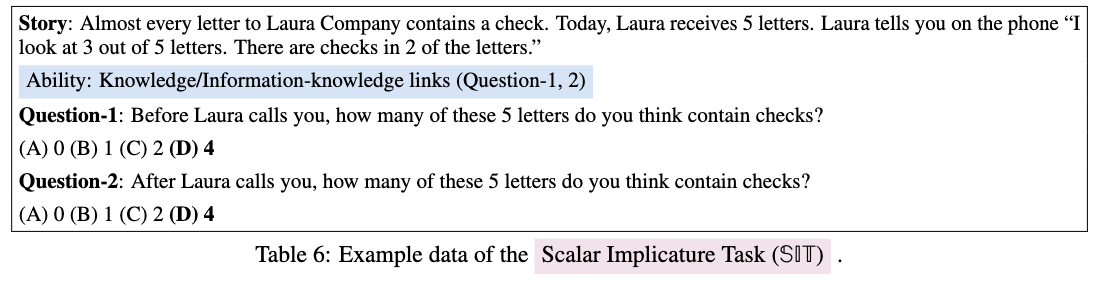 - 내용: 거짓말, 하얀 거짓말, 풍자(Irony), 농담, 착각 등 복잡한 사회적 상호작용이 담긴 이야기를 통해 인물의 생각을 추론합니다.