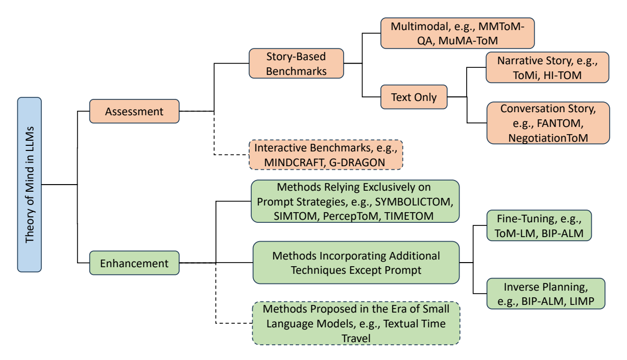 Figure 1: This paper reviews both the evaluation and enhancement of theory of mind capabilities in LLMs. For evaluation, we cover passive, story-based benchmarks and adaptable interactive benchmarks. For enhancement, we discuss recent effective methods, including prompt-only approaches and strategies incorporating additional techniques, as well as earlier methods from the era of small language models. Due to space constraints, interactive benchmarks and earlier methods (indicated in the dashed area) are provided in the Appendix E and Appendix F.