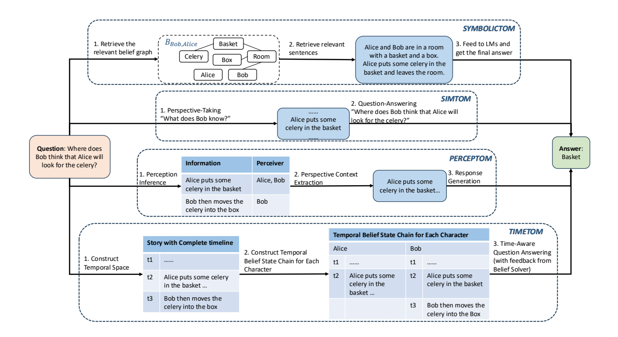 Figure 2: A comparison of methods for enhancing LLMs’ ToM capabilities through different prompting techniques, using the following narrative as context. Story: Alice and Bob are in a room with a basket and a box. Alice puts some celery in the basket and leaves the room. Bob then moves the celery into the box (Sclar et al., 2023).