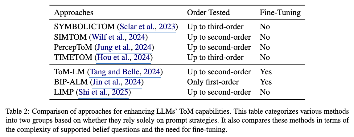 이 섹션에서는 기존 Text-Only Benchmarks에서 대규모 언어 모델(LLMs)의 Theory of Mind (ToM) 능력의 한계를 드러낸 연구들 [Wu et al., 2023; Ma et al., 2023a; Kim et al., 2023 등]을 언급하며, 이를 개선하기 위한 다양한 전략의 필요성을 강조한다. 특히, Table [2]에서는 최근 제안된 ToM 능력 향상 방법들을 두 가지 주요 접근 방식으로 구분한다: *프롬프트 전략만을 활용하는 방법*과 최적화, 미세 조정(fine-tuning) 등 추가 기법을 결합한 방법이다. 이 분류는 기존 벤치마크에서 드러난 LLMs의 ToM 이해 부족 문제를 해결하기 위한 기술적 방향성을 제시하며, 특히 ATOMS 프레임워크의 핵심 개념(의도, 믿음, 지식 등)을 기반으로 한 평가 기준과의 연계성을 강조한다. 연구팀은 이러한 전략들이 다층적 질문 유형(1차/2차 믿음, 현실/기억)과 같은 복잡한 사회적 상황을 처리하는 데 기여할 수 있다고 분석한다.