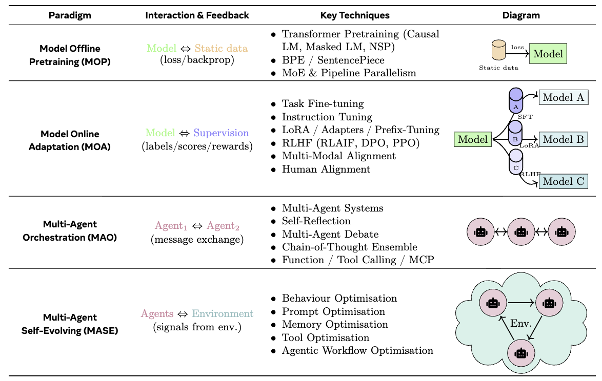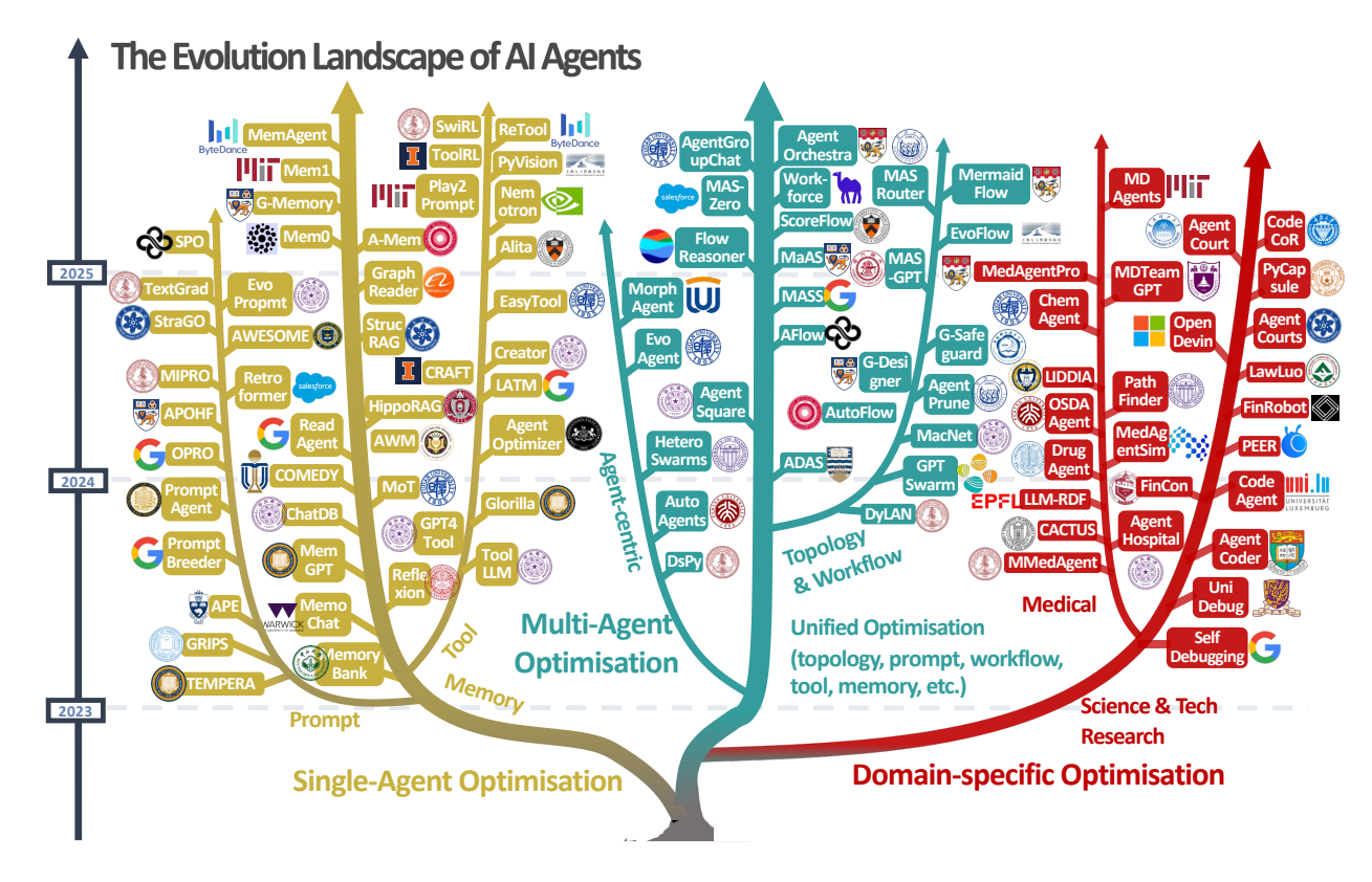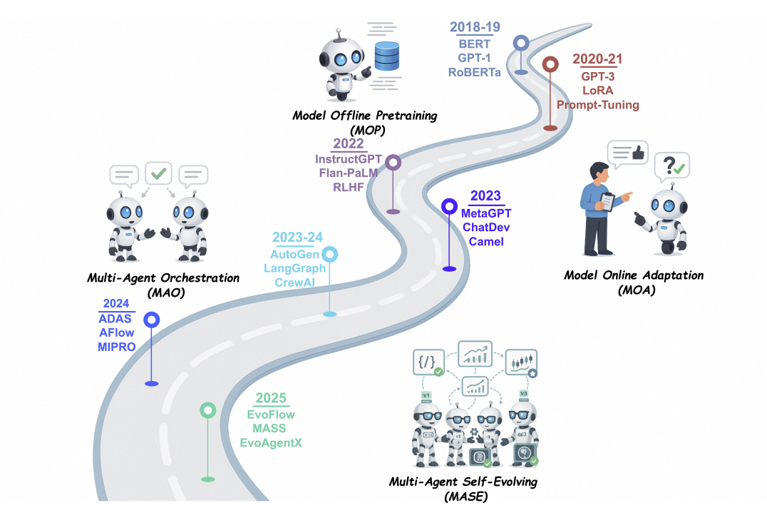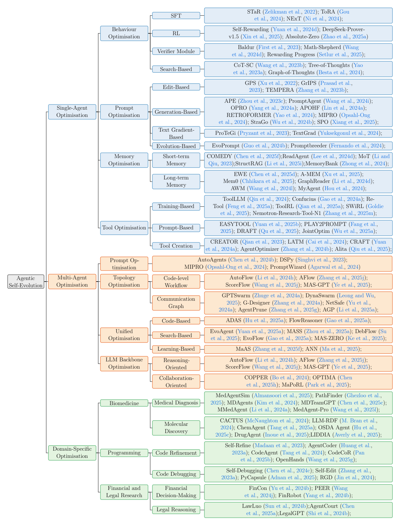 - 실험 결과: 2023–2025년 기간 동안 3,000개 이상의 관련 연구를 분석하여, 단일 에이전트 최적화(예: 프롬프트/메모리 개선), 다중 에이전트 협업(예: 메시지 교환/워크플로우 최적화), 특정 도메인(의료/금융 등)에 적용된 진화 전략을 체계적으로 정리