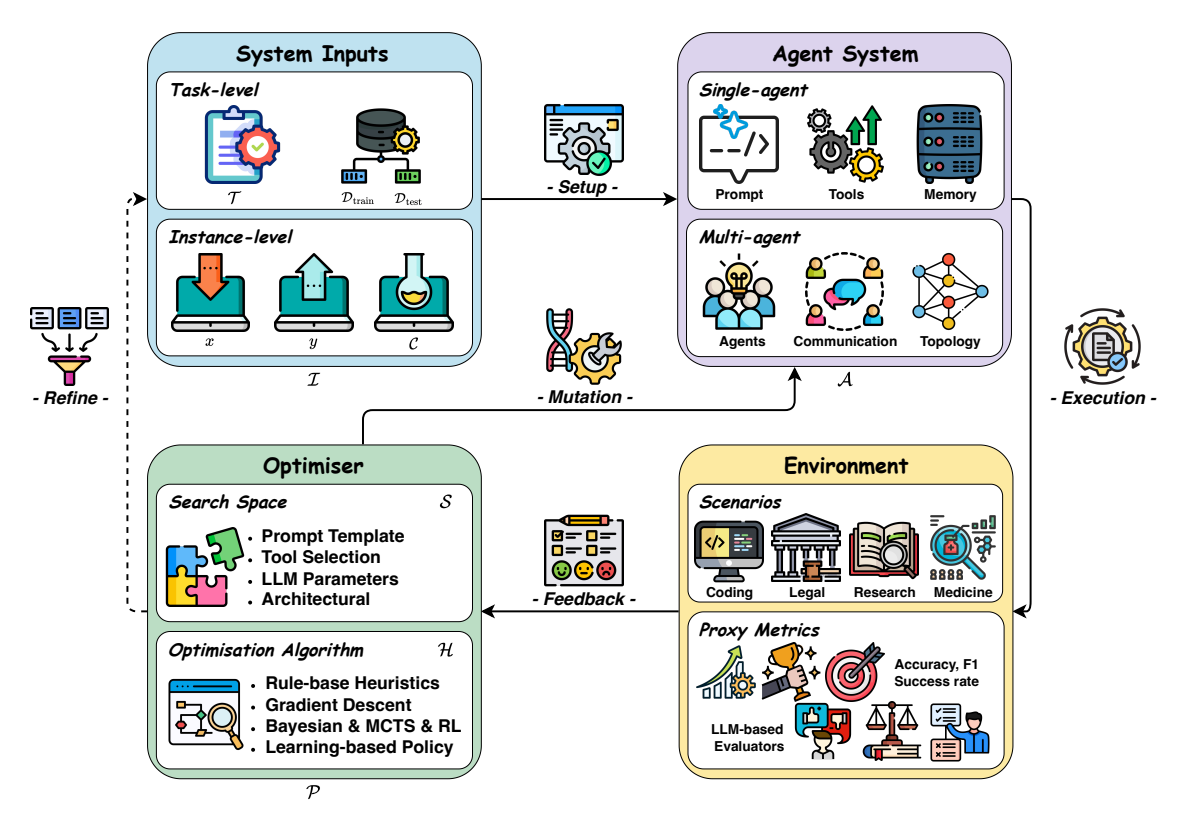 - 통합 개념 프레임워크 제안: 시스템 입력(System Inputs), 에이전트 시스템(Agent System), 환경(Environment), 최적화자(Optimisers) 4가지 핵심 구성 요소를 기반으로 피드백 루프를 추상화
