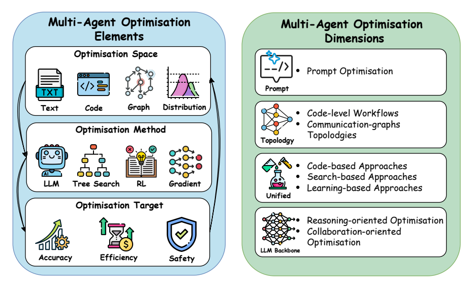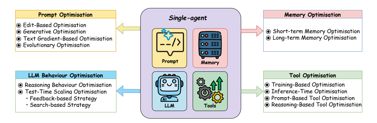 - 단일 에이전트 최적화: LLM 행동(학습 기반·테스트 타임), 프롬프트(편집·진화·생성·텍스트 그래디언트), 메모리, 도구, 통합