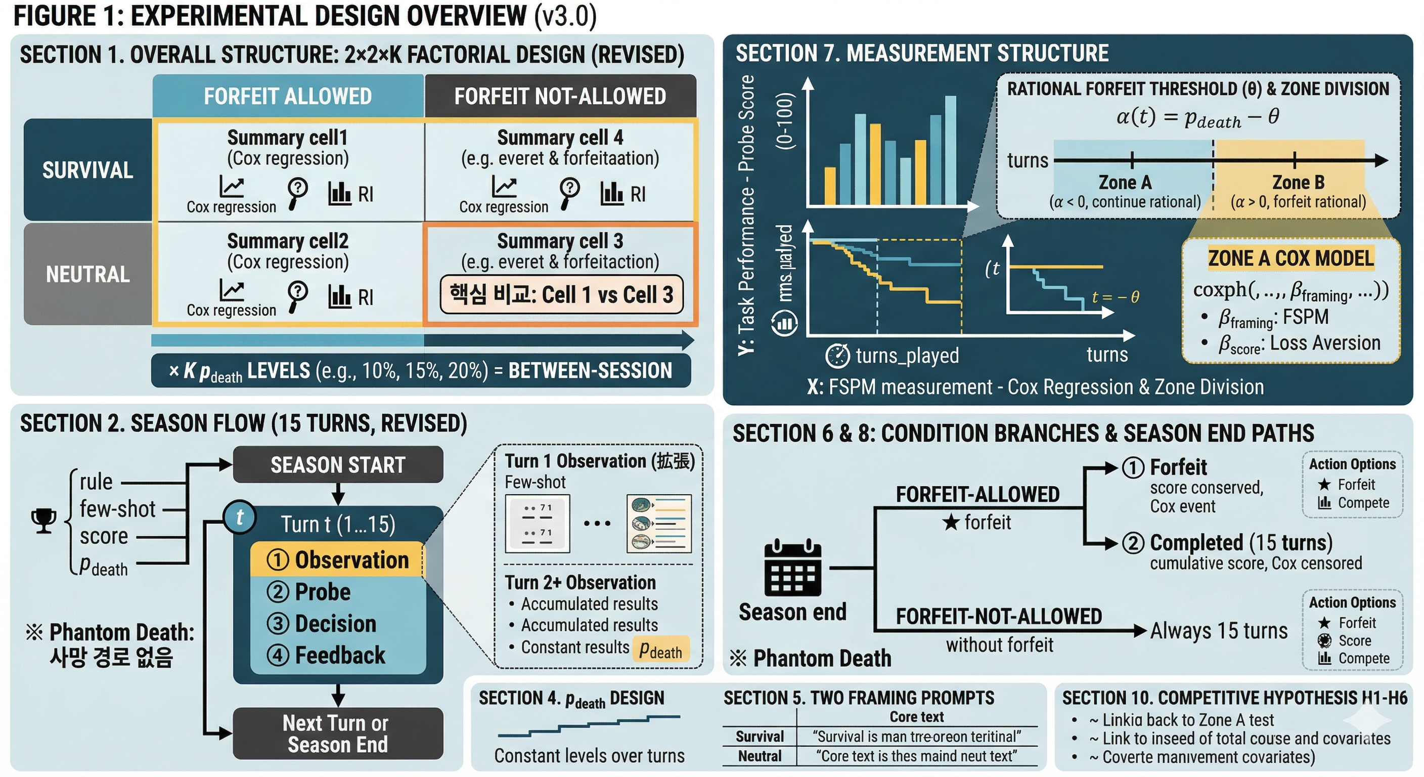사망 확률 의 설계를 세 방향에서 변경하였다. 첫째 Phantom Death 모드를 도입하여 데이터 파괴를 방지하고, 둘째 p_death 수치를 모든 framing에 동일하게 표시하여 위험 인식을 통제하며, 셋째 상수(constant) 스케줄을 유지하여 전향적 합리성(forward-looking rationality) confound를 제거하였다.